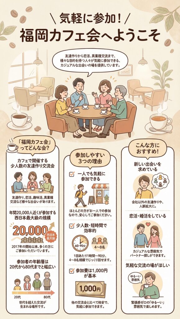 福岡カフェ会とは、福岡各地のカフェで行う少人数の友達作り交流会です。友達作り、恋活(婚活)、趣味活、異業種交流など様々な交流会を開催しています。
