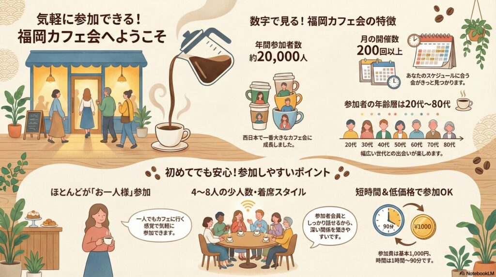 2017年の5月に立ち上げてから今ではおかげさまで、20代から80代の方まで、年間20000名近くの方が参加する西日本で一番大きなカフェ会になりました。
